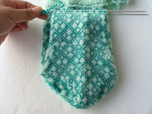 I like it, I think. Though the next time I do a colorwork sock, I’ll just do a striped sole or something, because man, the heel turn and gussets were overly complicated.