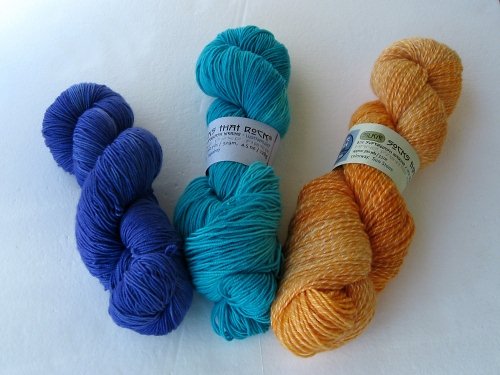 Blue Moon Fiber Arts Socks that Rock Lightweight in Star Sapphire and Aquaboy, and Silkie Socks that Rock in Sunstone. Believe it or not, I’ve never worked with STR before. I’ve never even bought any before now. But I’m so glad waited until I could buy these in person – I adore the colors! (The Aquaboy’s actually not that true to color in this photo, though; it’s a bit more green than this.)
