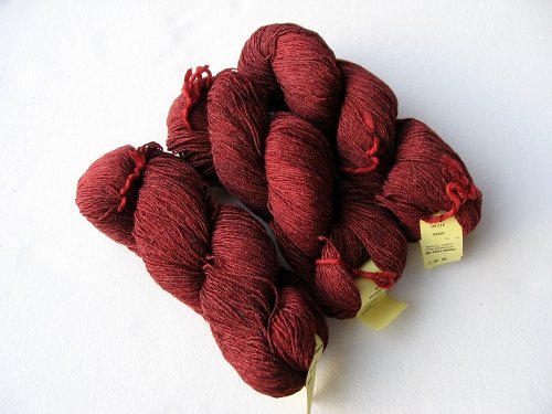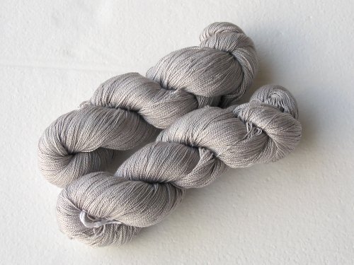 RedFish Dye Works 20/2 Silk. This is so much more beautiful in person, trust me. I was drawn to all the pretty colors in the booth, but this particular one wasn’t even on the display shelves. The dyer overheard Marisa pointing me toward the greys and silvers and then pulled out a bunch of other skeins for me from under the table. I’m planning on using this for the Cleopatra Wrap.